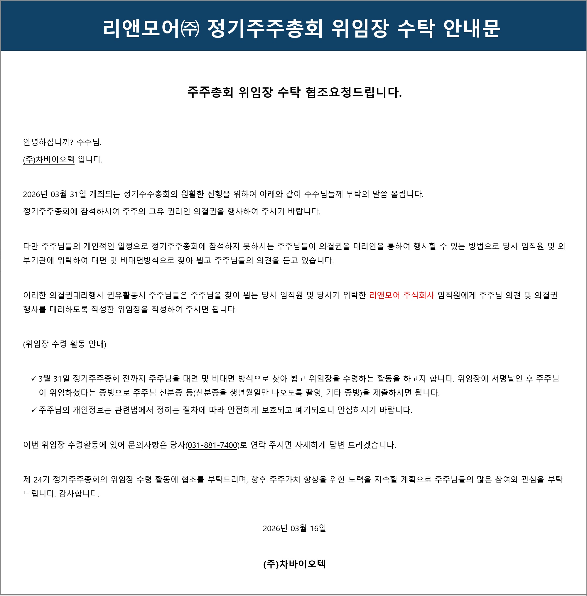 [차바이오텍] 리앤모어㈜ 정기주주총회 위임장 수탁 안내문